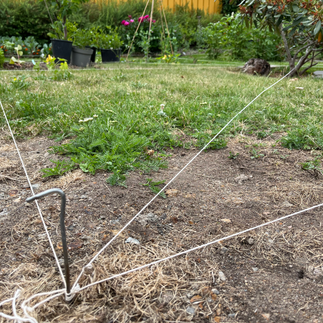 Ved hjelp av hvit hyssing og teltplugger fikk jeg en oversikt over form og størrelse og bestemte meg for at jeg skulle ha et frukttre i hvert av de fire hjørnene.